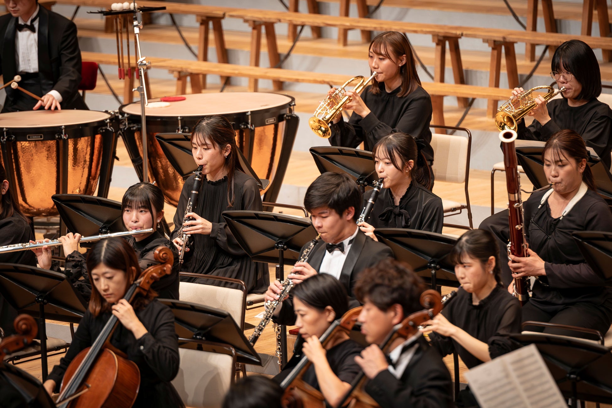 指揮を手がけるのは、国内外の多くのオーケストラと共演し世界的に活躍する演奏学科教授の大友 直人氏。学生たちの力を最大限に引き出し、音楽解釈や表現を深めながらも、学生が自ら気づき、考え、表現する姿勢を育む指導を行っています。集中練習や当日の最終リハーサルを経て迎えた本番。会場は期待に満ちた観客でほぼ満席となり、熱気に包まれました。