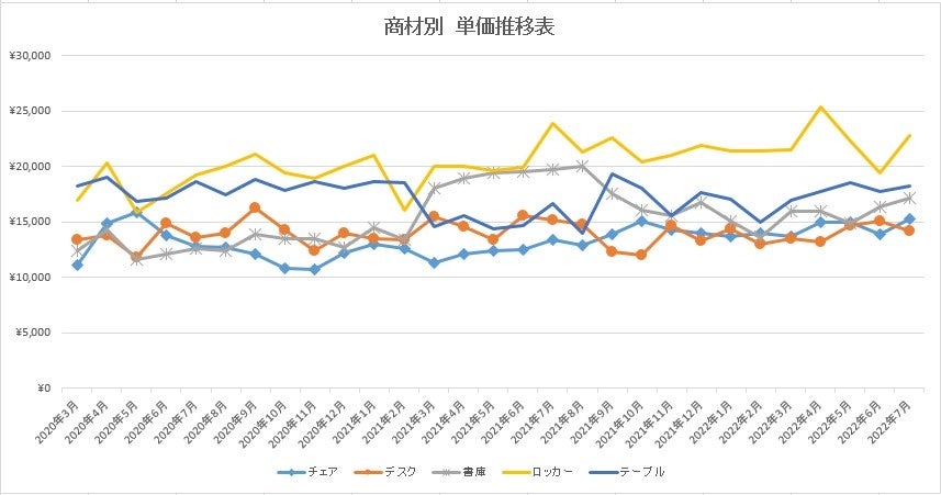 2000円以上単価が減少した。8月は中小企業様を中心に需要が高く、スタックテーブルなどで販売数量はあったが、大型テーブルの需要は少なく、全体期には単価減少の結果となった。