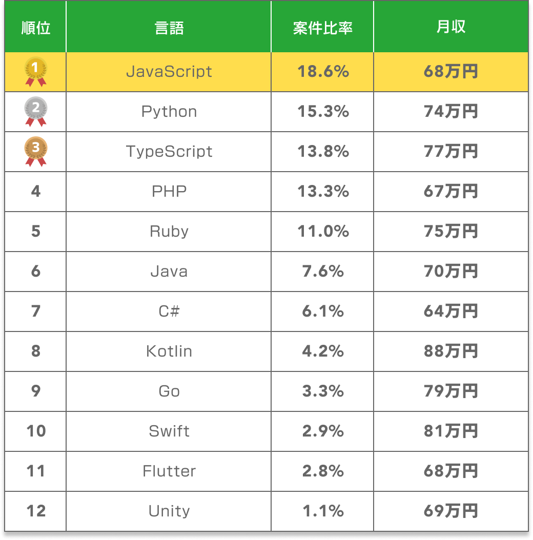 案件数の多さは競争の激しさでもありますが、スキルに応じた案件を見つけやすい環境が整っている言語といえます。