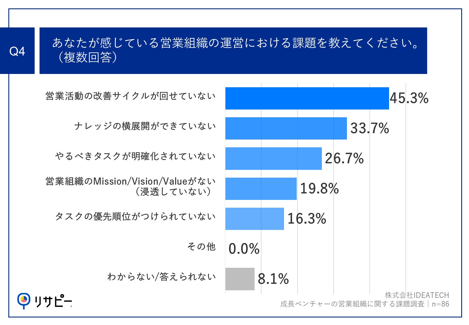 加えて、営業組織の運営においては、約半数の回答者が「営業活動の改善サイクルを効果的に回せていない」という問題を抱えていることも明らかになりました。