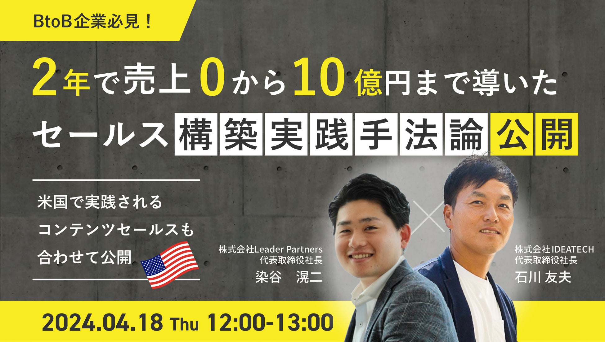 ファクトに基づいたコンテンツ開発とマーケティング支援を行う、株式会社IDEATECH(本社:東京都港区、代表取締役社長:石川友夫)はセールス分野(IDEAセールス事業)にも支援領域を拡げたことを記念して、この度株式会社Leader Partners(本社:東京都渋谷区、代表取締役:染谷滉二)と共同で、2024年4月18日(木)12:00-13:00に「2年で売上0から10億円まで導いたセールス構築実践手法論を公開〜米国で実践されるコンテンツセールスも合わせて公開〜」と題するオンラインセミナーを開催いたしますので、お知らせいたします。