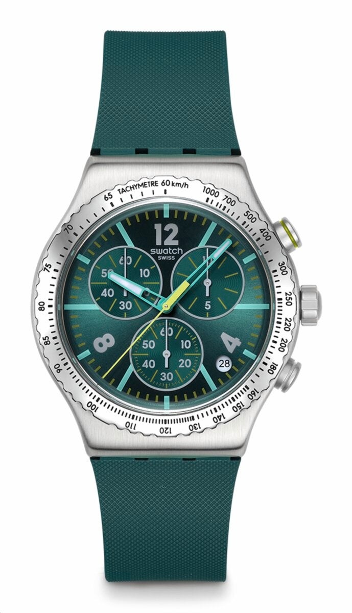 針: 暗闇で光るターコイズの時針・分針、イエローのクロノグラフ秒針