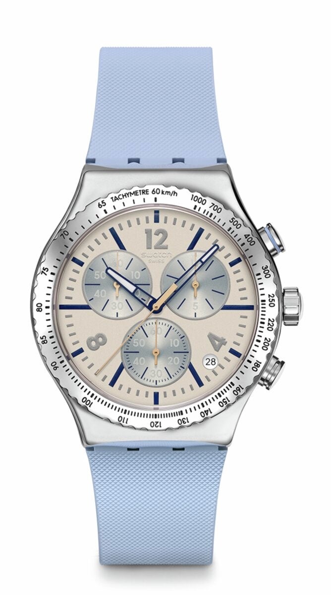 文字盤: アイボリーからライトブルーに変化するカラーラッカー仕上げ、マルチカラープリント、4時〜5時位置の間に日付表示