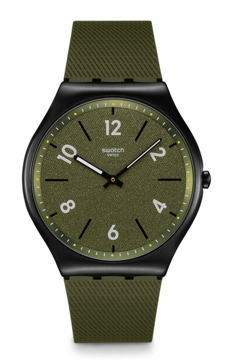 ストラップ: マットダークグリーンのストラクチャー仕上げ、同色ループ、ブラックPVD加工を施したブラッシュ仕上げステンレススチール製バックル