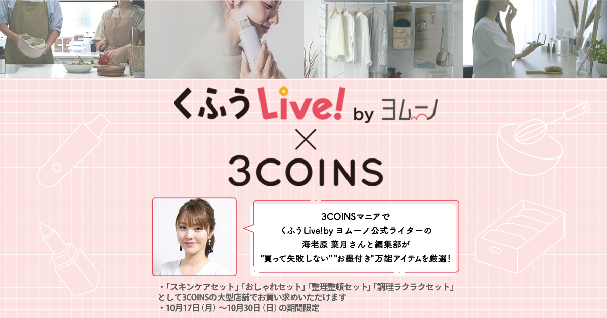 くふうカンパニーグループにおいて、くらし情報メディア「くふうLive! byヨムーノ」(https://www.o-uccino.jp/article)を運営する株式会社ロコガイドは、3COINS(スリーコインズ)とのコラボレーション企画を開始します。「くふうLive! byヨムーノ」公式ライターで3COINSマニアの海老原葉月さんと編集部が協働で「買って失敗しない」をテーマに厳選した万能アイテムを、「スキンケアセット」「おしゃれセット」「整理整頓セット」「調理ラクラクセット」として提案。3COINSの大型店舗(計39店舗)にて特設ブースを10月17日(月)〜10月30日(日)の期間限定で展開します。