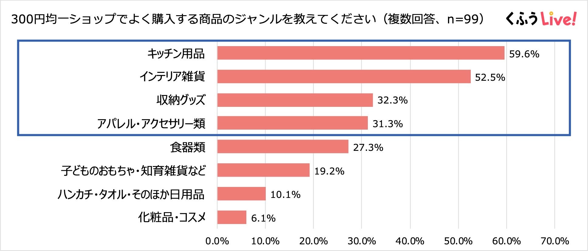 ヨムーノメイトを対象に2022年3月にアンケートを実施したところ、「300円均一で商品を購入する理由」については、「おしゃれさ・実際の価格よりも高価な印象があること」との回答が78.8%で最多となり、次いで「実用性」が51.5%となりました。また、300円均一ショップでよく購入する商品のジャンルについてたずねたところ、「キッチン用品」が59.6%、「インテリア雑貨」が52.5%、「収納グッズ」が32.3%、「アパレル・アクセサリー類」が31.3%で上位となりました(※2)。