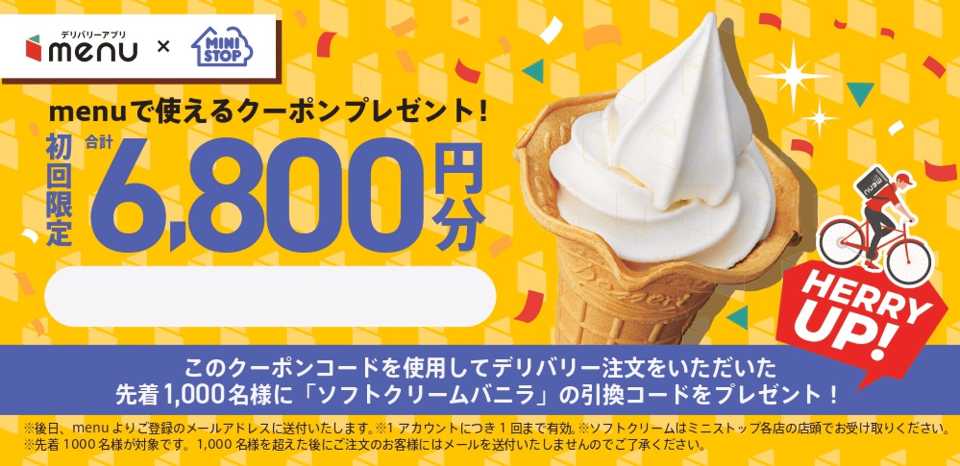 キャンペーン期間中、対象エリアにあるミニストップ各店のサイネージや店頭でmenuの初回限定クーポンを合計6,800円分配布します。本クーポンを利用してmenuアプリからデリバリー注文していただいたお客様の中から先着1,000名様に、ミニストップ店頭で「ソフトクリームバニラ」と引き換えできるデジタルクーポンコードをプレゼントいたします。