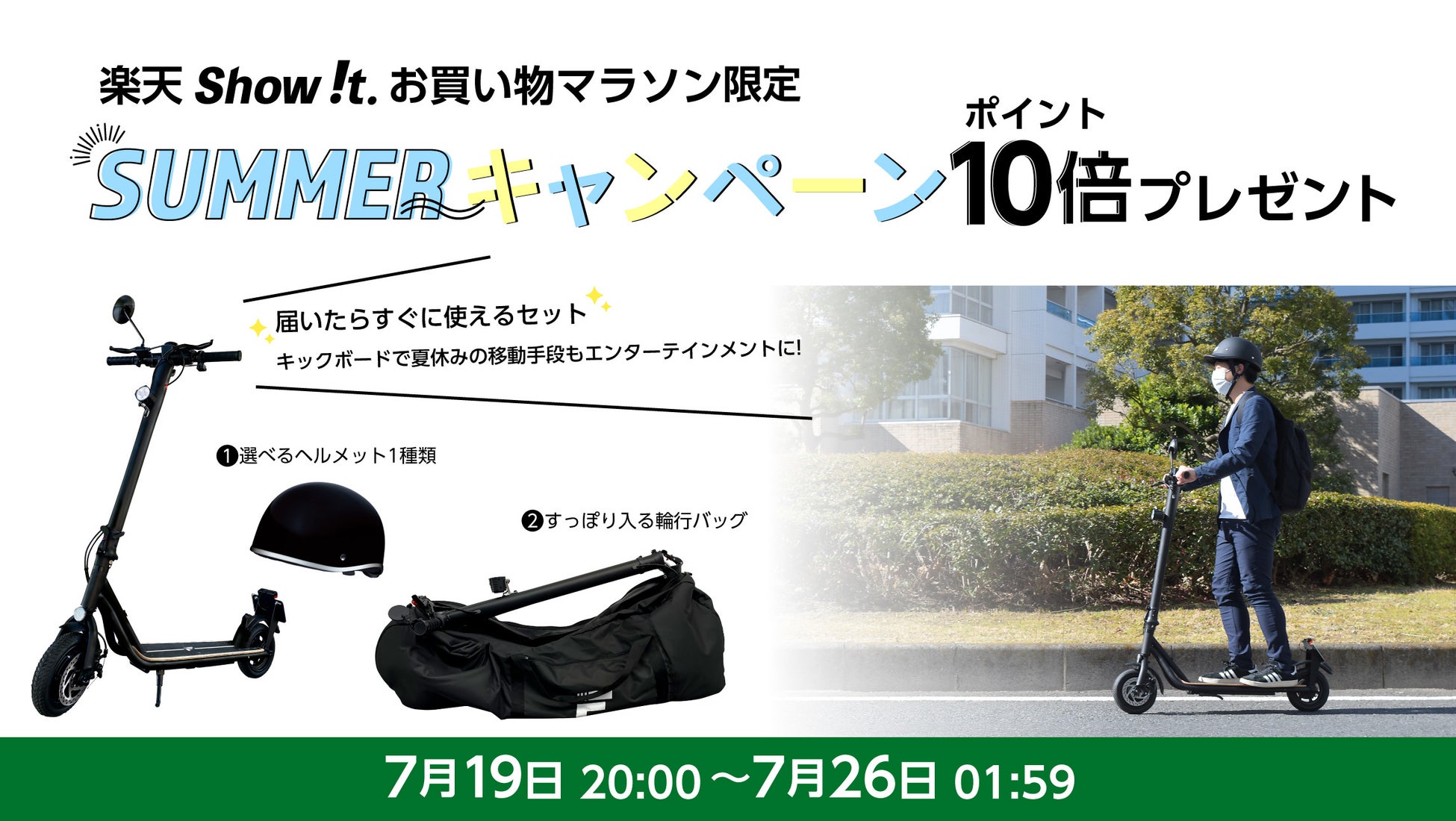 楽天市場「Show !t」7月19日(火)20時から、電動キックボード購入するとお得なヘルメットと輪行バックセットのプレゼントを実施、さらに、全商品ポイント最⼤10倍!楽天お買い物マラソンに参加。