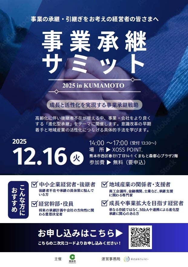 熊本市(市長:大西 一史)は、市内中小企業等の事業承継の推進に向けた取組として、12月16日(火)に「事業承継サミット2025」を開催することをお知らせいたします。
