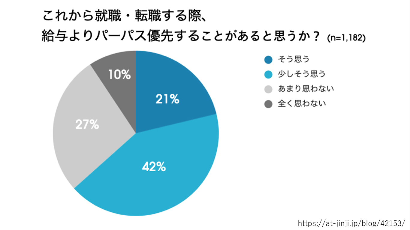 事実として、企業の想いや歴史、風土、社会性などを体現する概念である「パーパス」を、給与よりも重視する求職者は約6割にも上り、もはや給与水準などは重視するものではなくなっていることが分かります。
