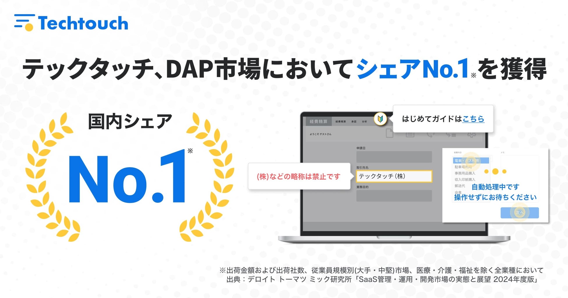 「テックタッチ」を開発・提供するテックタッチ株式会社(本社:東京都港区、代表取締役 CEO:井無田仲、以下 当社)は、デロイト トーマツ ミック経済研究所株式会社(本社:東京都千代田区、代表取締役社長:渡邊茂男、以下 デロイト トーマツ ミック経済研究所)が2024年7月に発行した市場調査レポート「SaaS管理・運用・開発市場の実態と展望 2024年度版」のデジタル・アダプション・プラットフォーム(以下、DAP)型ツール市場において、シェアNo.1を獲得したことをお知らせします。