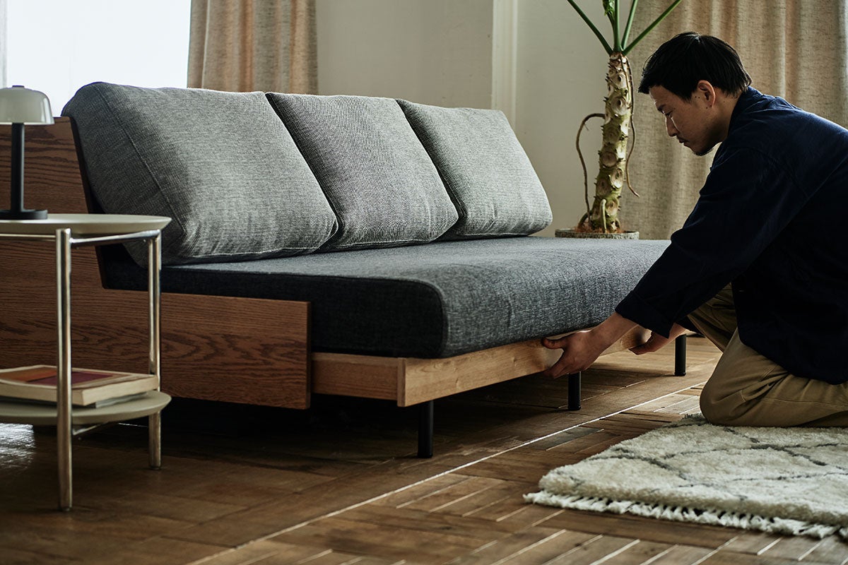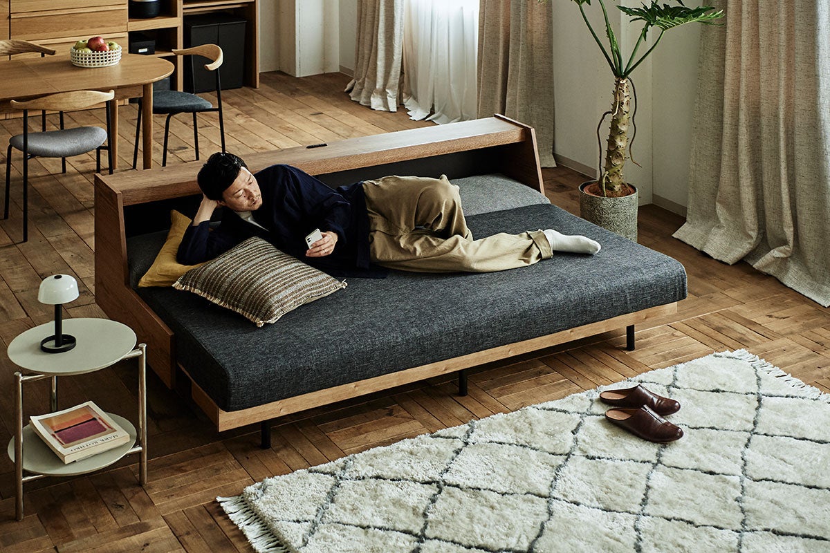 一方で、都市部の限られたスペースに暮らす単身者にとっては、昼間はスタイリッシュなソファとして過ごし、夜は快適なベッドとして眠りの時間をサポートする一台二役の家具として活躍します。ベッドに展開した際の座面サイズはセミダブルマットレスの規格に近いため、広々とした寝心地を実現。さらに、張地や座面の質感が上質なため、どの使い方でも妥協のない快適さを提供します。