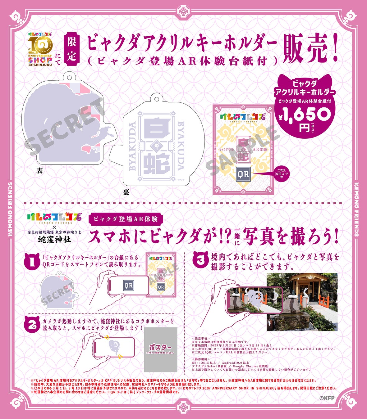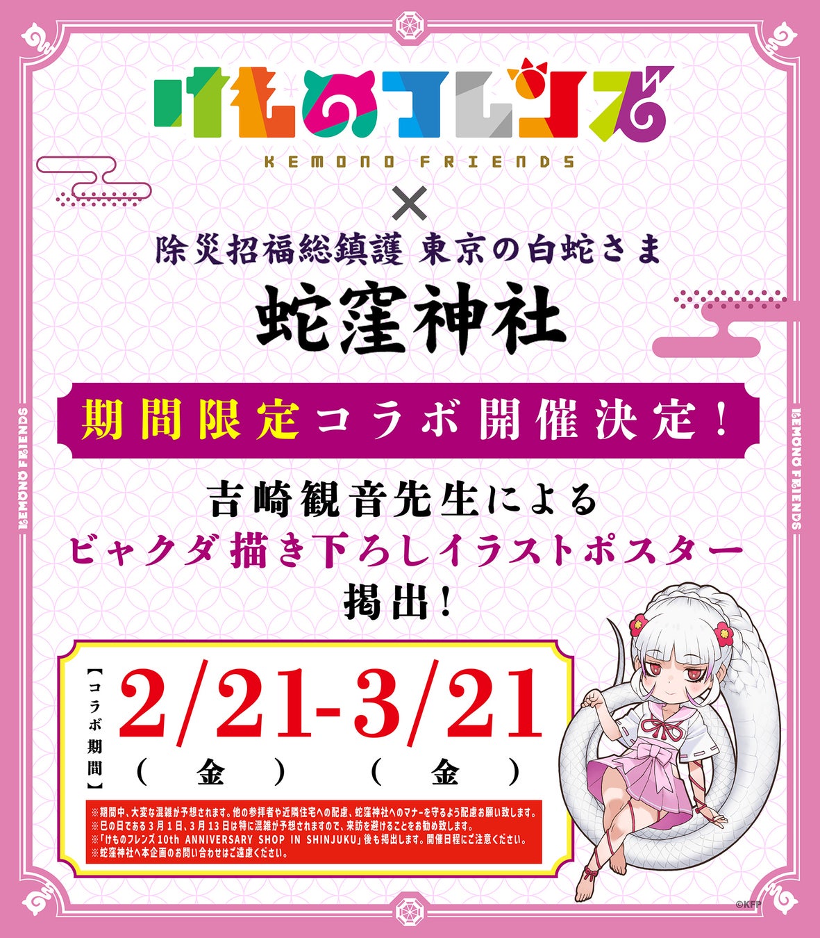 700年以上の歴史があり、古くから“東京の白蛇さま”と親しまれてきた蛇窪神社(東京都品川区)の境内に、期間中、描き下ろしイラストを用いたポスターを掲出するほか、「けものフレンズ 10th ANNIVERSARY SHOP IN SHINJUKU」 にて販売のグッズを購入した方が楽しめるAR体験イベントを実施予定。
