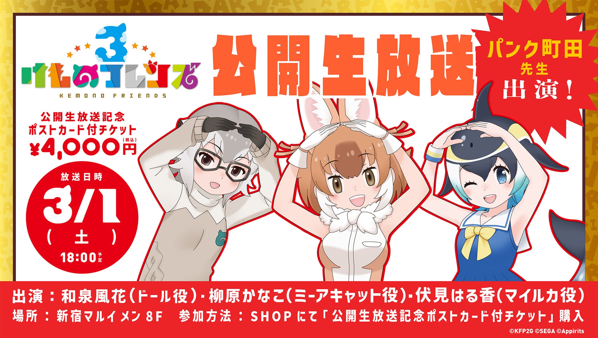 さらに、3月1日(土)18時より新宿マルイ メン8Fイベントスペースにて「けものフレンズ3」の公開生放送を実施。 出演は和泉風花(ドール役)、柳原かなこ(ミーアキャット役)、伏見はる香(マイルカ役)が決定している。