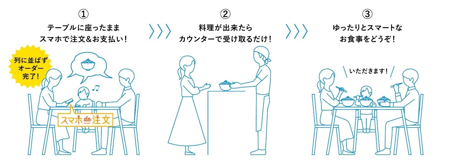 フードコートの商品を選択、注文、決済することが可能で、お店に並ばなくても席から注文できる便利な機能です。ご家族やご友人同士でそれぞれ別のお店のメニューを注文する際にもスムーズに購入することができ、快適にご利用いただくことが可能です。