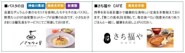 新業態や海老名市初出店の店舗を含め、バリエーションを拡大。東京で人気の「日本橋 天丼 金子半之助」や「NEW OLD STYLE 肉そばけいすけ」が出店するほか、小さなお子さま向けに離乳食も扱う「パスタの日」など、ファミリーが利用しやすい店舗も出店します。