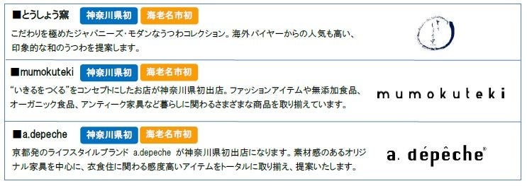 神奈川県初出店の店舗3店を含む、おうち時間を充実させるこだわりのインテリア・雑貨店、日常づかいはもちろん、県内外から訪れたくなる充実の店舗ラインアップが拡充します。