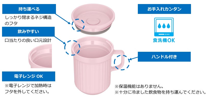 このたび新発売する『スープマグ(DJU-220/320)』は、スープを持ち運びできる樹脂製のスープマグです。樹脂製なので軽く、電子レンジでスープを再加熱することができます。フタはしっかり閉まるネジ構造で、安心して持ち運ぶことができます。さらに口当たりの良い丸口設計、持ちやすいハンドル付きで快適なスープランチを楽しむことができます。食洗機対応で、本体・フタ・パッキンと少ないパーツ構成のためお手入れも簡単です。