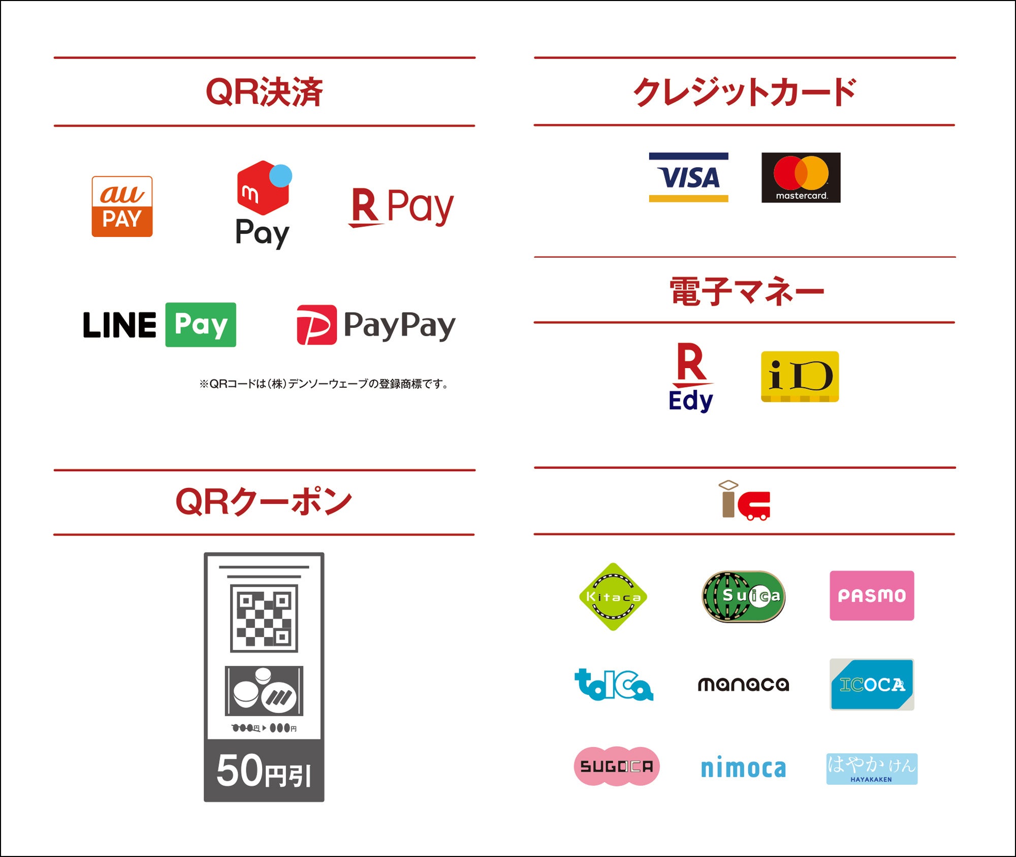 このたび刷新する新たな券売機は、交通系電子マネー9ブランドの他、VISA・Mastercardの2種のクレジットカードや、楽天Edy・iDの2種の電子マネー、PayPay・LINEPayなど5種のQRコード決済の計18ブランドが、ご利用いただけるようになります。現金を使用することなく、スピーディーなご注文・お会計を実現します。