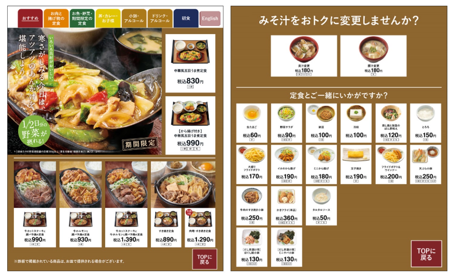 また、新しい大型のタッチパネルは、一画面により多くの商品を表示することが可能となるため、豊富なラインナップの中から快適に商品をお選びいただけます。また、サイドメニューの追加なども提案させていただくことで、お客様の商品選択の幅を広げます。