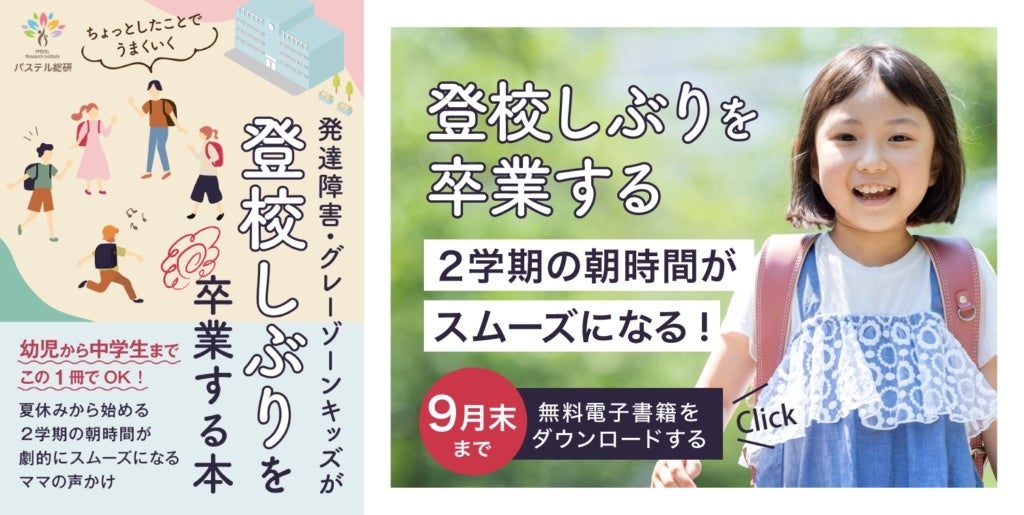 発達障害やグレーゾーンの子どもたちが生きやすい時代をつくるきっかけづくりをする専門サイト『パステル総研』を運営する株式会社パステルコミュニケーション(本社:東京都豊島区、代表取締役:吉野加容子)は、登校しぶりに立ち向かうお母さま向けの電子書籍「ちょっとしたことでうまくいく発達障害・グレーゾーンキッズが登校しぶりを卒業する本」をパステル総研ホームページより、無料ダウンロード開始します。〈https://www.agentmail.jp/lp/r/6928/64659/?prt〉