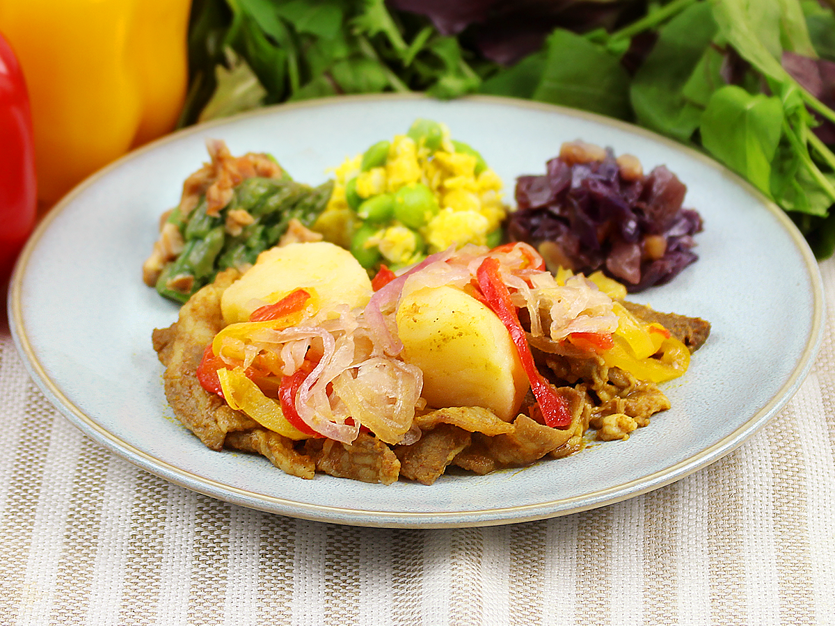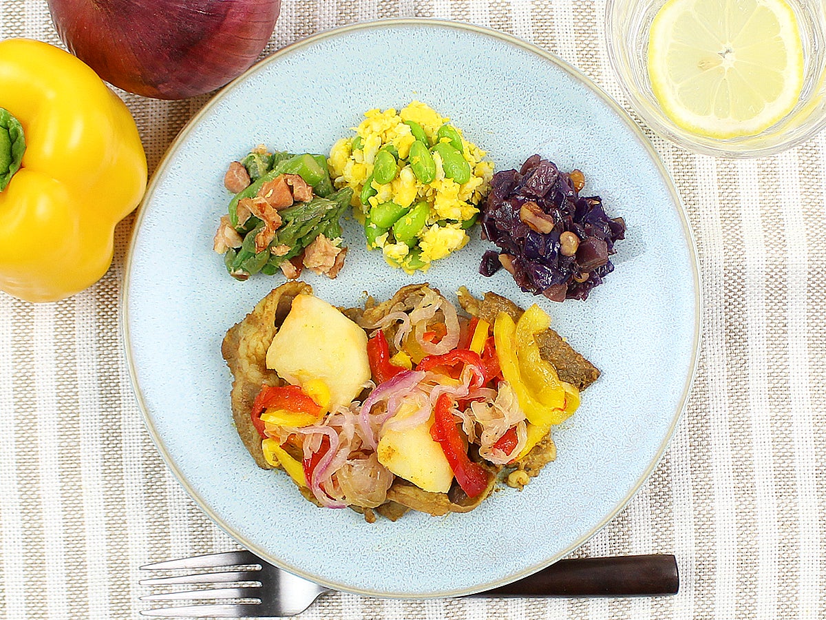 副菜は、コンソメ味のアスパラベーコン、枝豆エッグソテー、牛肉の旨味が隠し味の赤キャベツ胡桃サラダです。