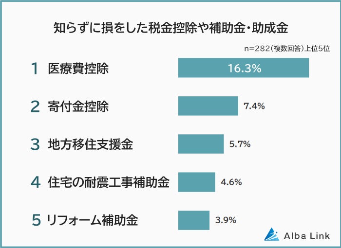 株式会社AlbaLink(本社:東京都江東区、代表取締役:河田 憲二)は、全国の男女282人を対象に「知らずに損をした税金控除や補助金・助成金に関する意識調査」を実施し、そのデータをランキングにしました。