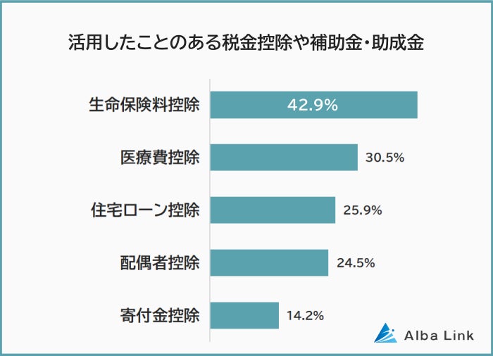 全国の男女282人に「活用したことのある税金控除や補助金・助成金」を聞いたところ、1位は「生命保険料控除(42.9%)」でした。2位は「医療費控除(30.5%)」、3位「住宅ローン控除(25.9%)」、4位「配偶者控除(24.5%)」と答えた人も多くなっています。