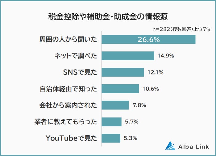 税金控除や補助金・助成金の情報はどこから得たか?という問いには、「周囲の人から聞いた(26.6%)」と回答した人がもっとも多くなりました。2位「ネットで調べた(14.9%)」、3位「SNSで見た(12.1%)」が続きます。アンケート結果からは、身近な人やSNSなどの口コミで制度について知った人が多いとわかりました。