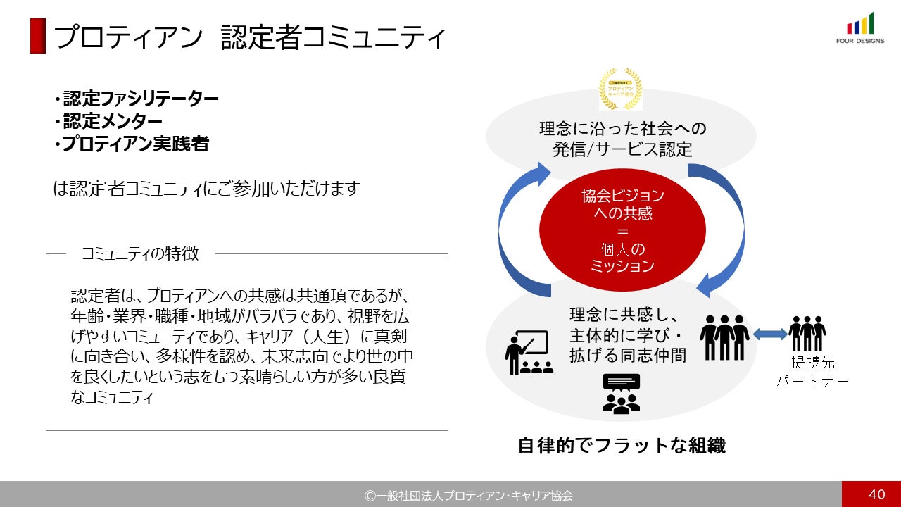 プロティアン・キャリア検定合格者の次のステージがプロティアン認定者です。プロティアン・キャリア理論をプロとして正しく世に伝えていく資格となっております。