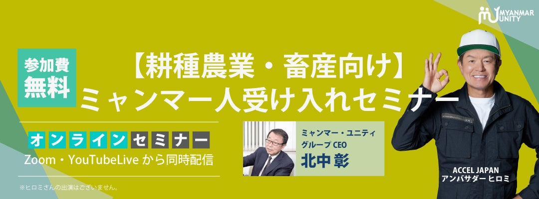 ミャンマー政府認定圧倒的No.1人材送り出し機関「ミャンマー・ユニティ」は、2024年5月15日(水)に「【耕種農業・畜産向け】ミャンマー人受け入れセミナー」を開催いたします。