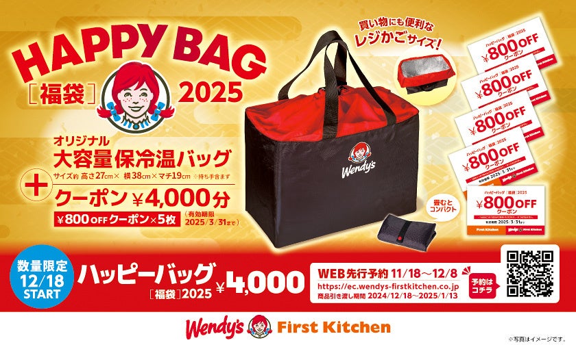 ウェンディーズ·ジャパン株式会社及び、ファーストキッチン株式会社 (所在地:東京都新宿区、代表取締役:紫関修) が展開する、ウェンディーズ・ ファーストキッチンとファーストキッチンでは、2024年12月18日(水)10時から、オリジナルの福袋を数量限定で販売します(競馬場店を除く)。福袋「ハッピーバッグ2025」(4,000円)は、オリジナルの大容量保冷温バッグに加え、販売価格と同額のクーポンがついた大変お得なセットとなっています。オリジナルの保冷温バッグはこの機会でしか手に入らない限定品で、ウェンディーズ·ファーストキッチンとファーストキッチンで異なるデザインをご用意しました。また11月18日(月)から12月8日(日)の期間でWEB先行予約を実施します。お得が詰まった「ハッピーバッグ2025」をぜひお買い求めください。