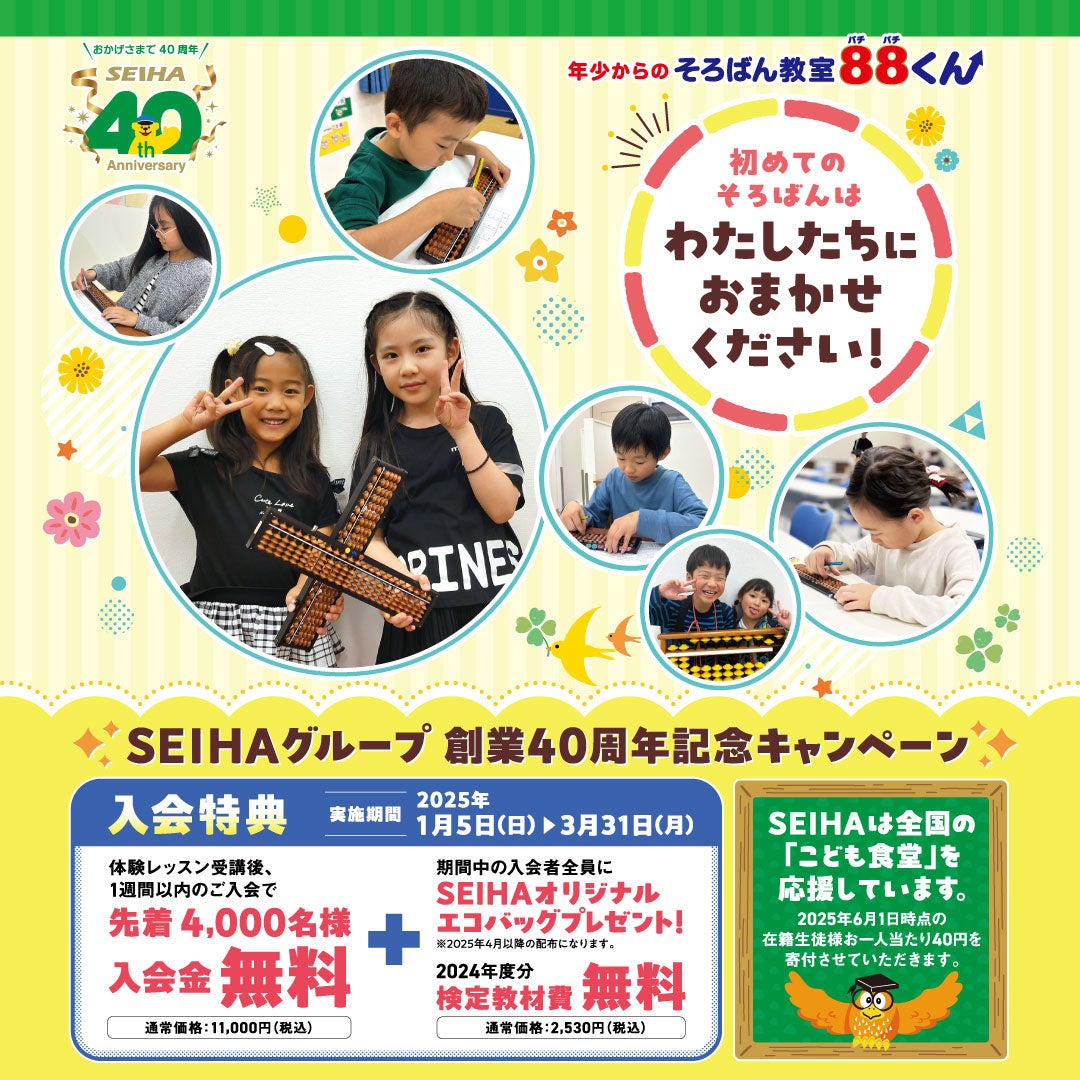 セイハネットワーク株式会社(福岡県福岡市,代表取締役:坂口 正美,以下セイハネットワーク)は、セイハグループ全ブランド対象に「セイハ創業40周年」のキャンペーンと開催しております。お客様の感謝の気持ちを込めてとさせて入会特典として、そろばん教室88くんでは先着4,000名様に入会金無料とさせていただきます。しかも今なら、期間中の入会者全員に「SEIHAオリジナルエコバック」プレゼント★それに加えて、2024年度分検定教材費無料!お得な特典が盛りだくさん。