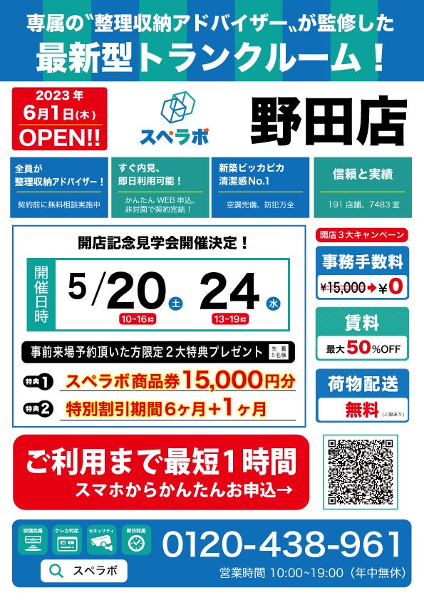 【野田店/6月1日(木)オープン】見学から契約、解約まで完全非接触・非対面、お申し込みからご利用まで最短1時間!都内、大阪などにて絶賛運営中のトランクルーム【スペラボ】が野田駅近くに出店!