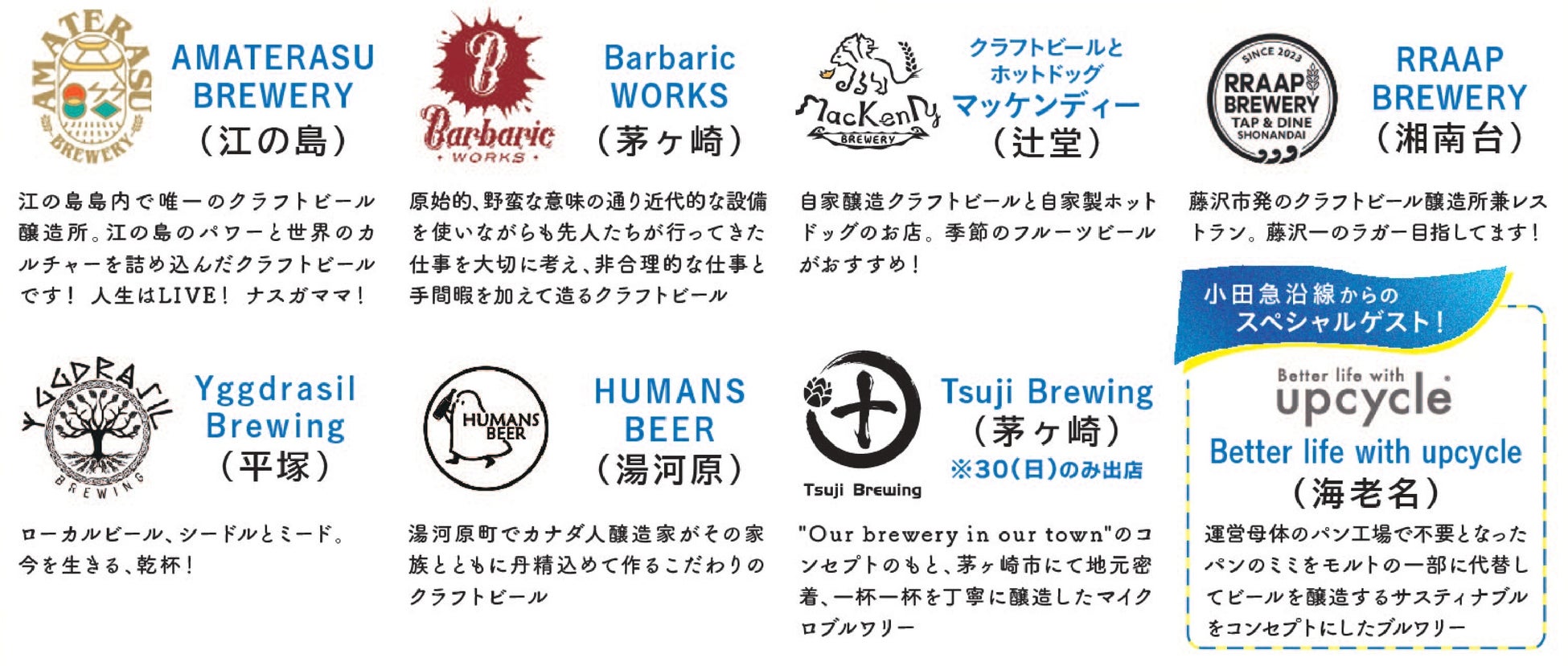 AMATERASU BREWERY(江の島)、RRAAP BREWERY(湘南台)、クラフトビールとホットドッグ マッケンディー(辻堂)、Barbaric WORKS(茅ヶ崎)、Yggdrasil Brewing(平塚)、HUMANSBEER(湯河原)、小田急沿線からのスペシャルゲスト出店:Better life with upcycle(海老名)