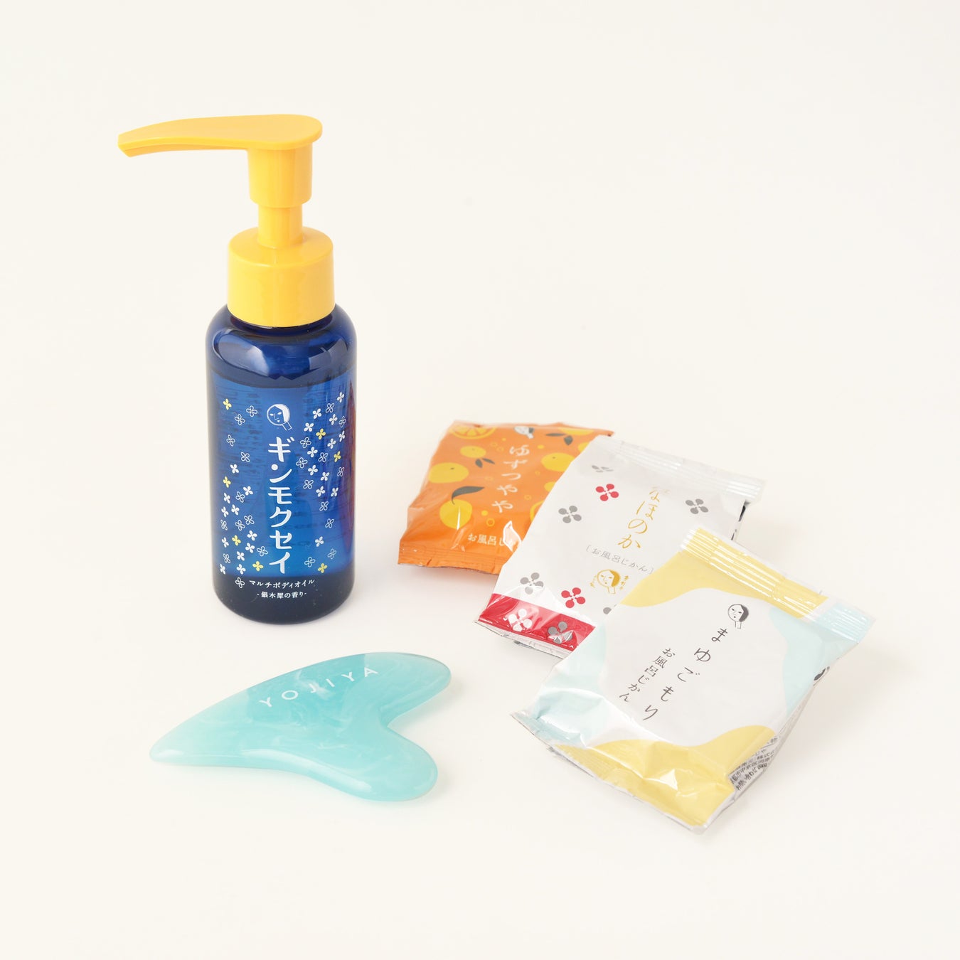 気軽にむくみケアができる「カッサ」が入った限定セット。 「マルチボディオイル ギンモクセイ」との併用で、肌への刺激から守り、保湿ケアにも◎ 3種の香りの入浴料も含め、日々の疲れを取り除き、癒しを与えてくれるスペシャルセットです。 ※250個限定 |
