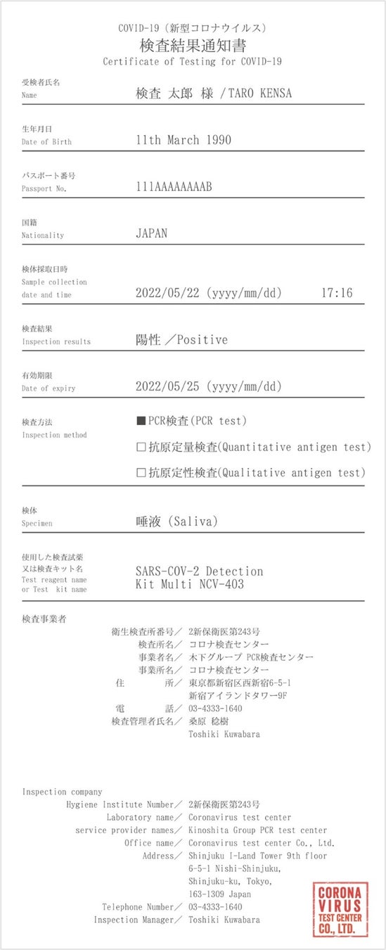 株式会社木下グループ(本社:東京都新宿区、グループCEO 木下直哉)は、全国に展開する「木下グループ 新型コロナ検査センター」全店において、『パスポート番号入り検査結果通知書(陰性証明書)』の有料提供(+立合発行手数料/1,000円(税込)【※検査費用別】)を、5月28日(土)より開始します。