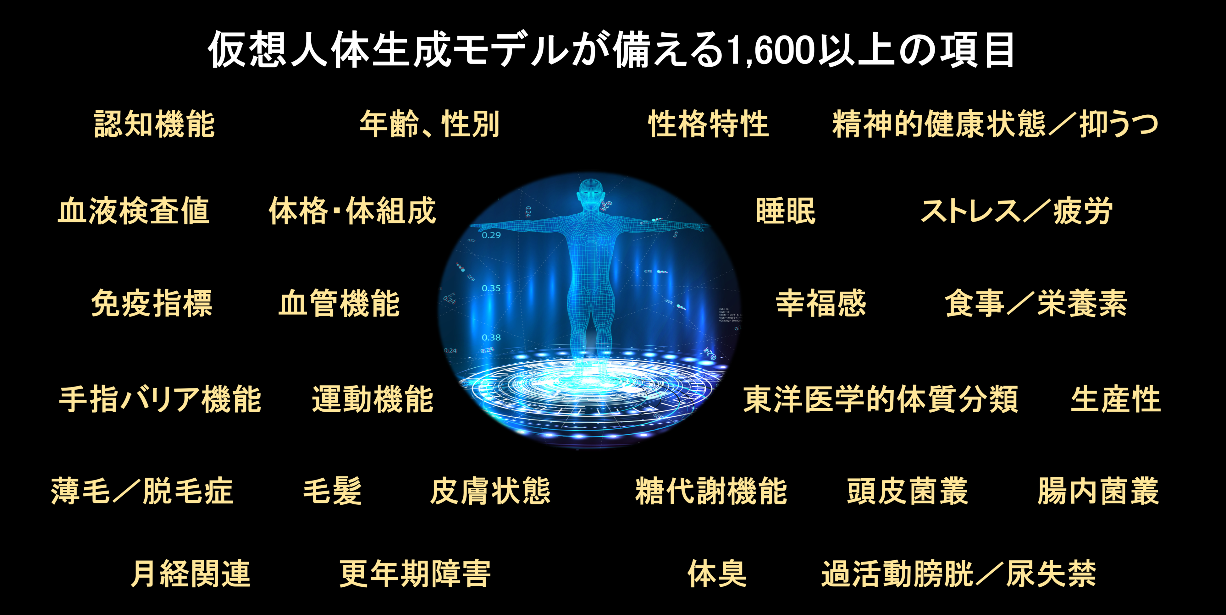 花王が株式会社Preferred Networksと開発した、健康診断などで得られる身体に関する項目から、ライフスタイル(食事、運動、睡眠など)や性格傾向、嗜好性、ストレス状態、月経などの日常生活において関心の高い項目まで、幅広く多種多様な1,600以上の項目を網羅的に備え、これらがどのようなパターンで現れるのかを示すことができる統計モデルです。ある項目のデータを入力すると、別の項目の推定データを出力することが可能です。入出力する項目は、備えられたすべての項目から自由に設定することができます。
