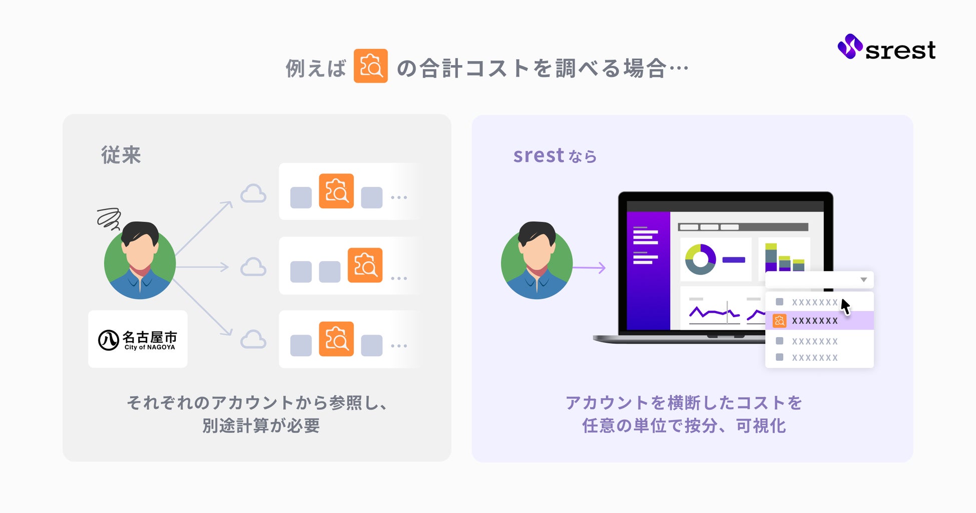 そこで、今回名古屋市では、クラウドの運用状況を可視化し、システム全体の最適化を図るため、実証実験を行うことになりました。「srest」を活用することで、ガバメントクラウド環境における日々のリソース使用状況やコストの変動を把握し、最適な運用計画を立てることが可能になります。さらに、「srest」のデータを活用し、運用コストの最適化を実現することで、より安定したクラウド運用体制の構築を目指します。