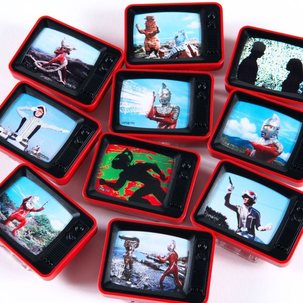 懐かしいTV型デザインにお馴染みのキャラクターを散りばめたアイテム。必殺技、名怪獣、最終回の名シーンとツボを押さえたチョイスも絶妙。懐かしくもあり新鮮さも感じられる。