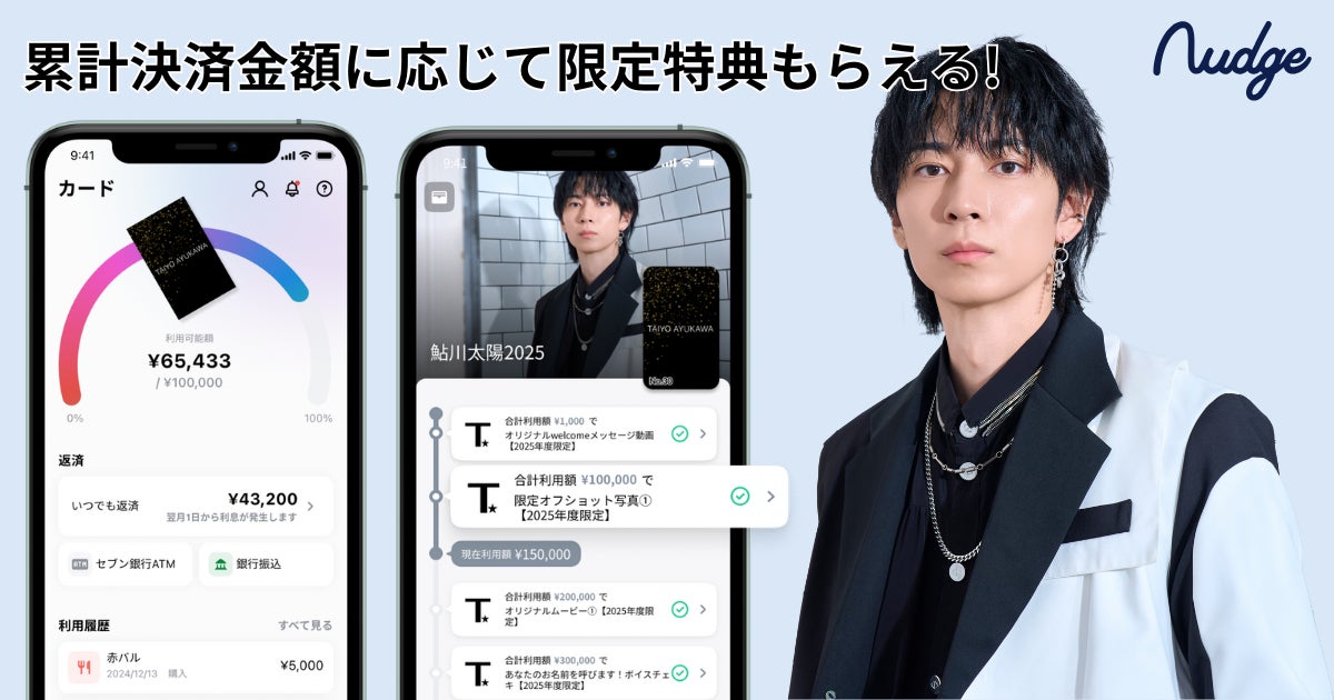 ナッジ株式会社(本社:東京都千代田区、代表取締役:沖田貴史)は、俳優・声優として活躍する鮎川 太陽さんと提携し、次世代クレジットカード「Nudge(ナッジ、以下「ナッジカード」)」にて、「鮎川太陽公式クレジットカード」の提供を4月1日(火)より開始しました。