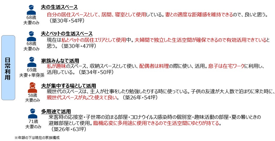 親世帯スペースの使われ方は多様化しており、収納のみで使用しているケースはわずか4%でした。一方で、居住スペースとして生活全般で使用している人が約5割、寝室や趣味、在宅ワークなど居室として活用する人が約3割に上ります。親世帯スペースは子世帯夫婦がそれぞれの暮らしに合わせて活用していることが分かりました。仕事や趣味の個室、リラックスできる専用空間を設けることで、互いの時間を尊重しながら快適な生活を実現していることが伺えます。