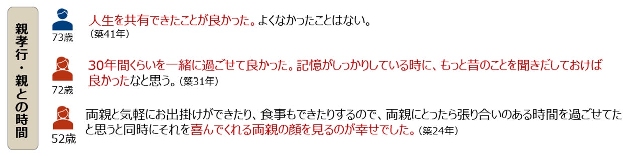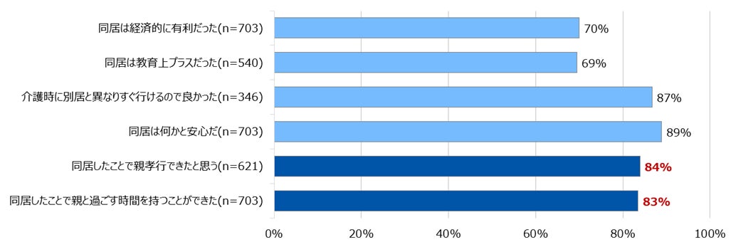 満足度の背景には、経済的メリットや育児・介護のサポートといった実利的な要因に加え、約8割が「親と過ごす時間を持てている」「親孝行ができている」と回答しました。二世帯同居は、生活空間の共有にとどまらず、家族の絆を深める場として機能していることがうかがえます。こうした情緒的価値が、長期的な満足度を支える重要な要素と考えられます。
