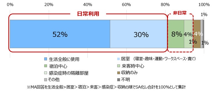 子世帯の空間活用状況のうち、収納のみはわずか4%で半数以上は生活全般に使用