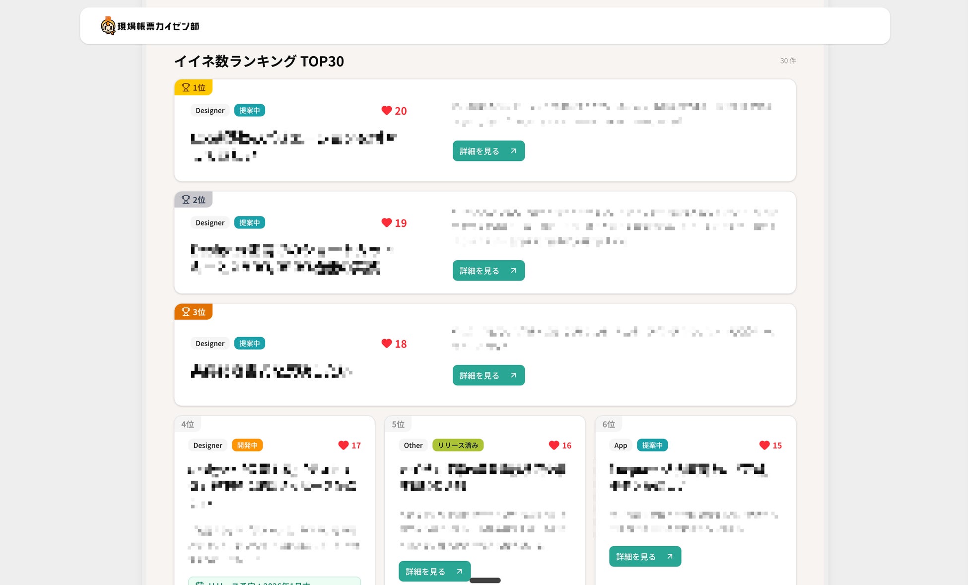 イイネ数の多い提案を上位30件、ランキング形式で表示。TOP3は目立つデザインで強調表示。営業力ではなく、"いいね数"という平等な指標で優先度が決まる