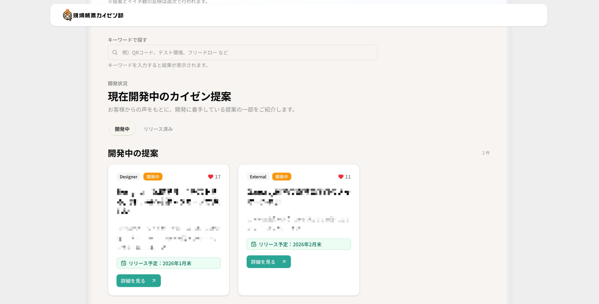開発中・リリース済みの提案を確認できるセクション。タブ切り替えで表示を変更し、件数を一目で把握。ユーザーは「自分の要望がどのステータスにあるか」をいつでも確認可能