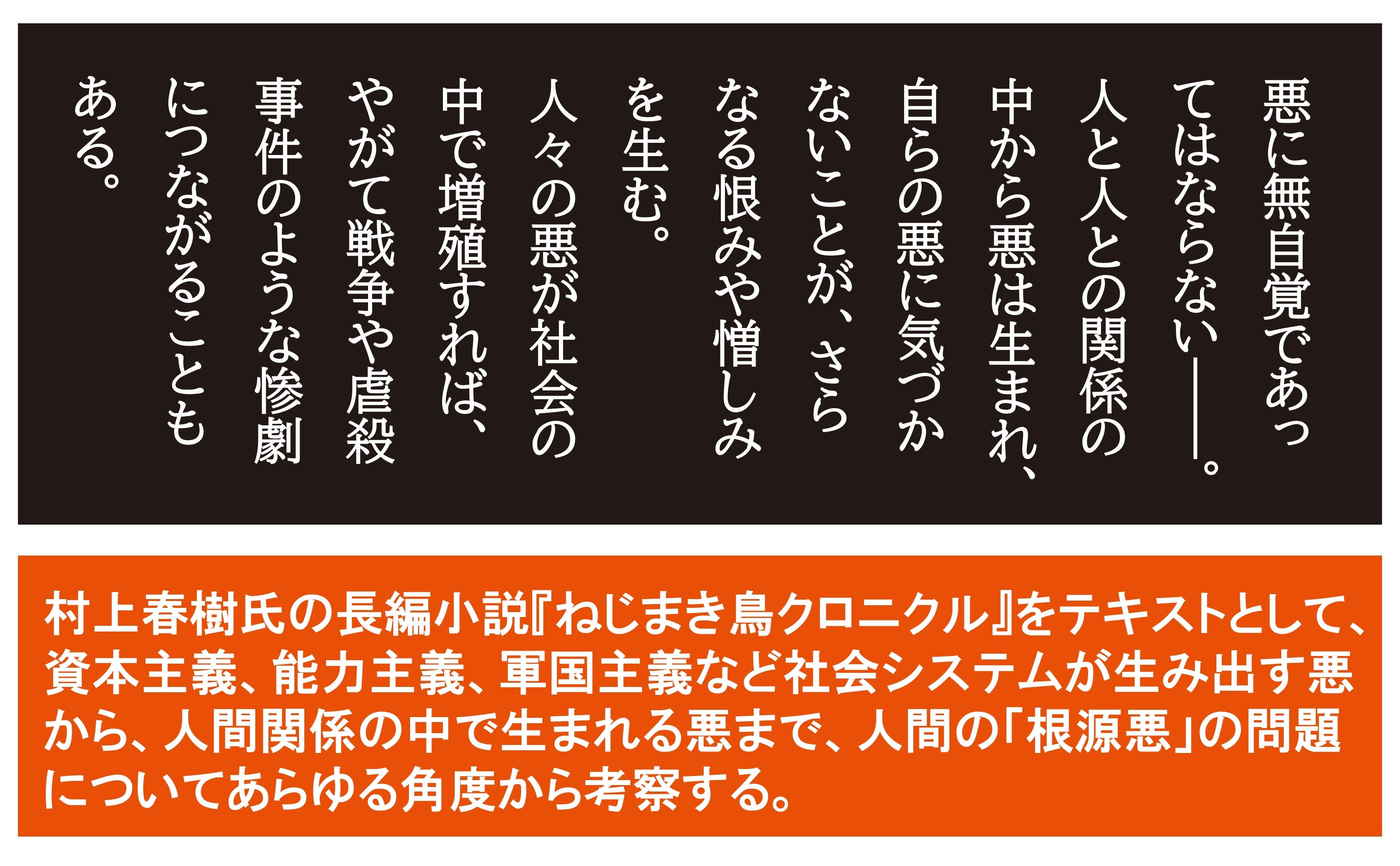 村上春樹氏の長編小説『ねじまき鳥クロニクル』をテキストとして、資本主義、能力主義、軍国主義など社会システムが生み出す悪から、人間関係の中で生まれる悪まで、人間の「根源悪」の問題についてあらゆる角度から考察する。