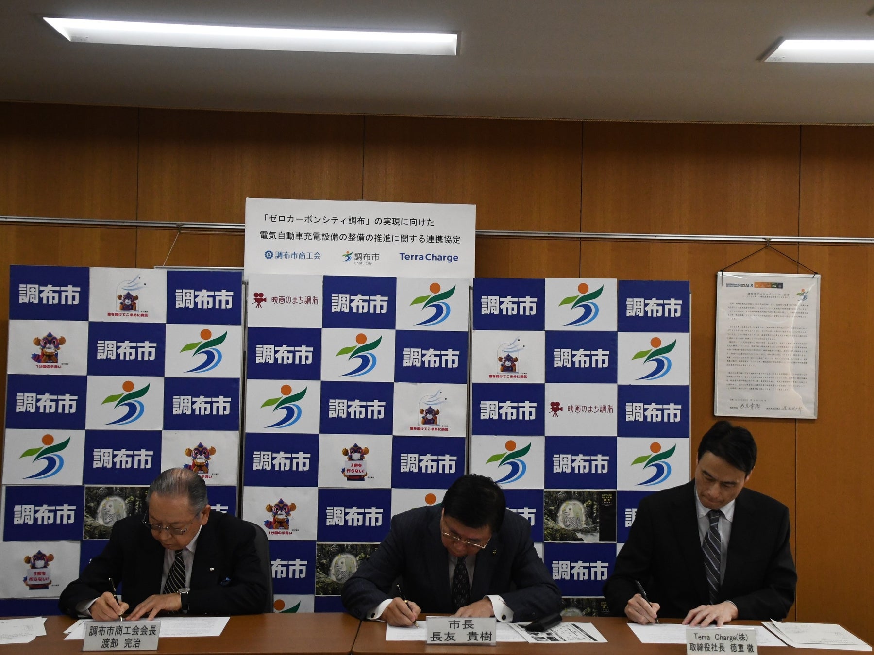 EV充電インフラ事業「Terra Charge(テラチャージ)」を展開するTerra Charge 株式会社(本社:東京都港区、代表取締役社長:徳重徹、以下「当社」)は、東京都の調布市、調布市商工会と3者で「ゼロカーボンシティ調布の実現に向けたEV充電設備整備の推進に関する連携協定」(以下「本協定」)を2024年2月20日に締結いたしました。