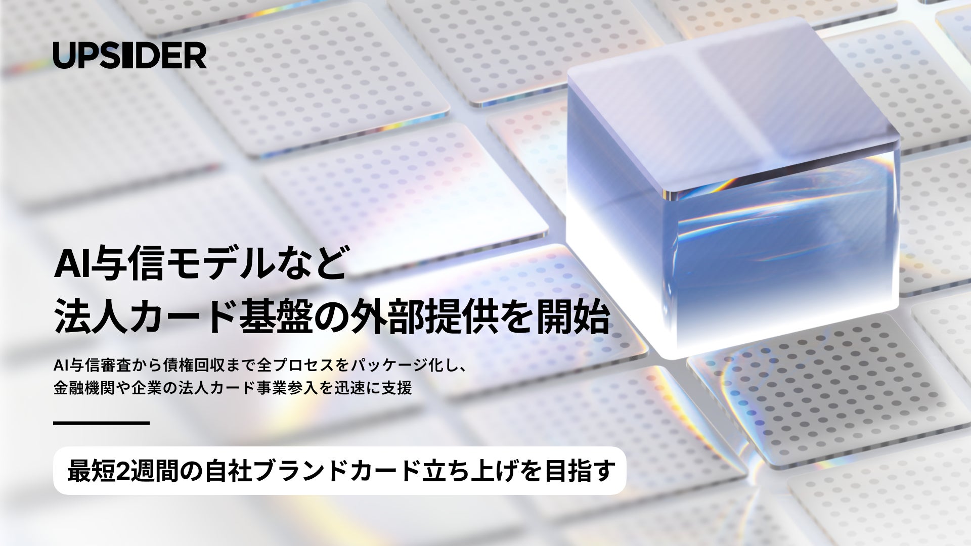 AIによる次世代法人カード「UPSIDER」(以下 UPSIDER)を提供する株式会社UPSIDER(代表取締役:宮城徹・水野智規、本社:東京都港区、以下 当社)は、UPSIDERのリリースから約5年間培ってきたAI与信モデルをはじめ、カード発行オペレーションや債権回収など、法人カード運用に必要なすべてのプロセスをパッケージ化し、法人カード基盤の外部提供を新たに開始することをお知らせいたします。これにより、金融機関や企業は自社ブランドの法人カードを発行することが可能となります。