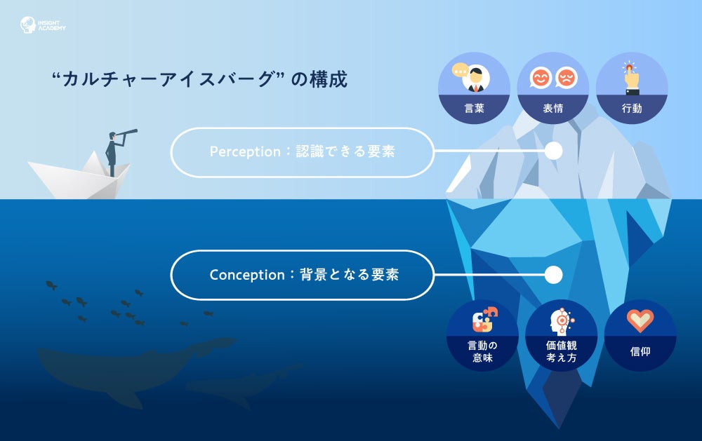文化はよく海の上に浮かんでいる氷山に例えられることがあり、文化にも氷山のように見える部分(Perception:認識できる要素)と、見えない部分(Conception:背景となる要素)があります。